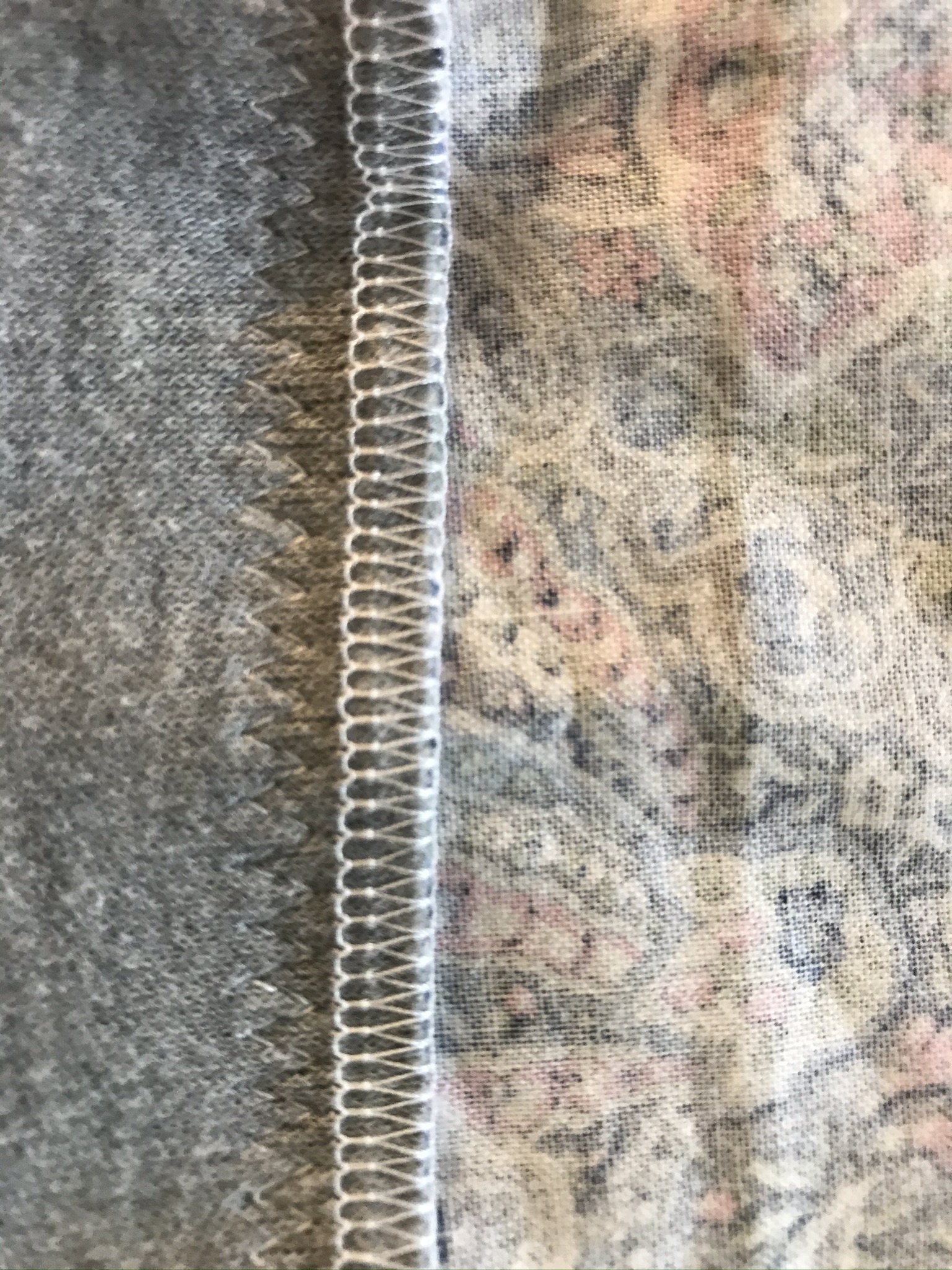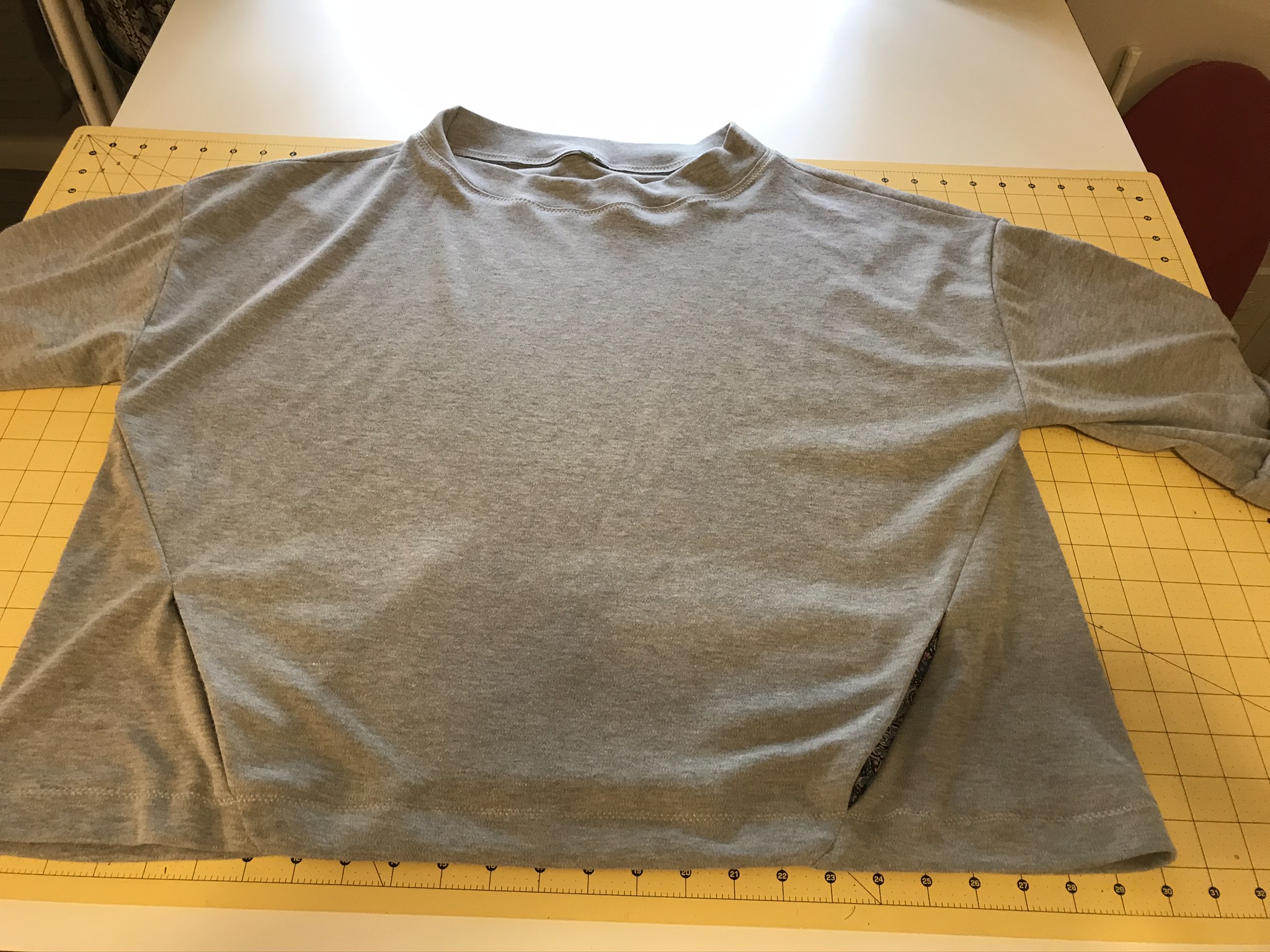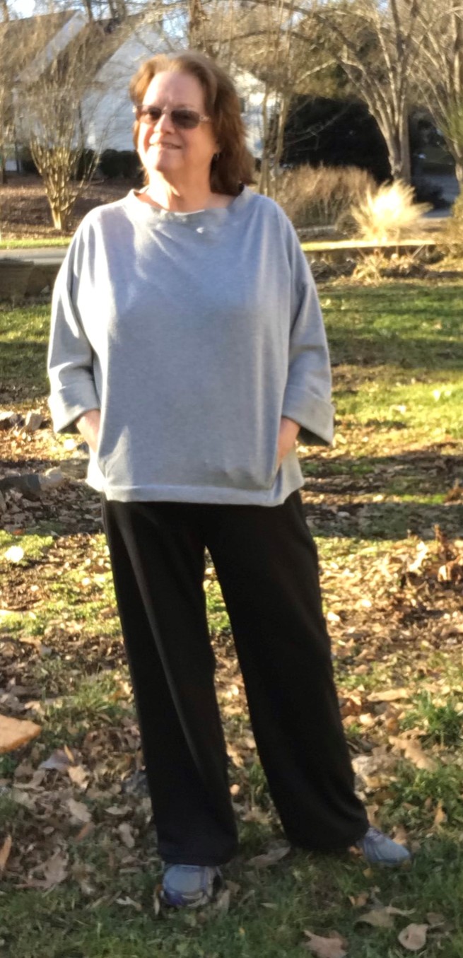 The pants are in a black Ponte knit from Mood Fabrics and the sweatshirt is in a gray sweatshirt fabric from Joann Fabrics.