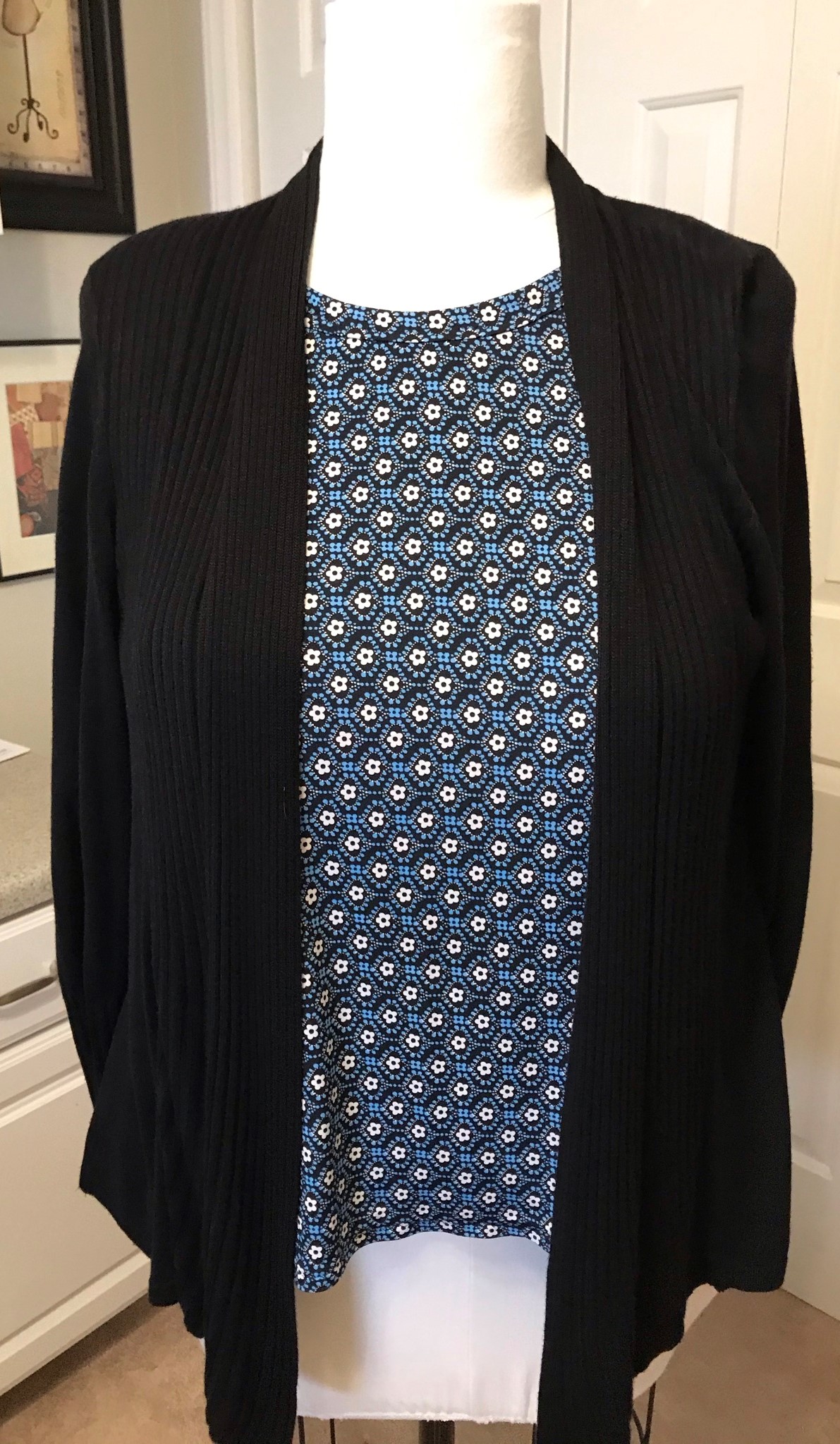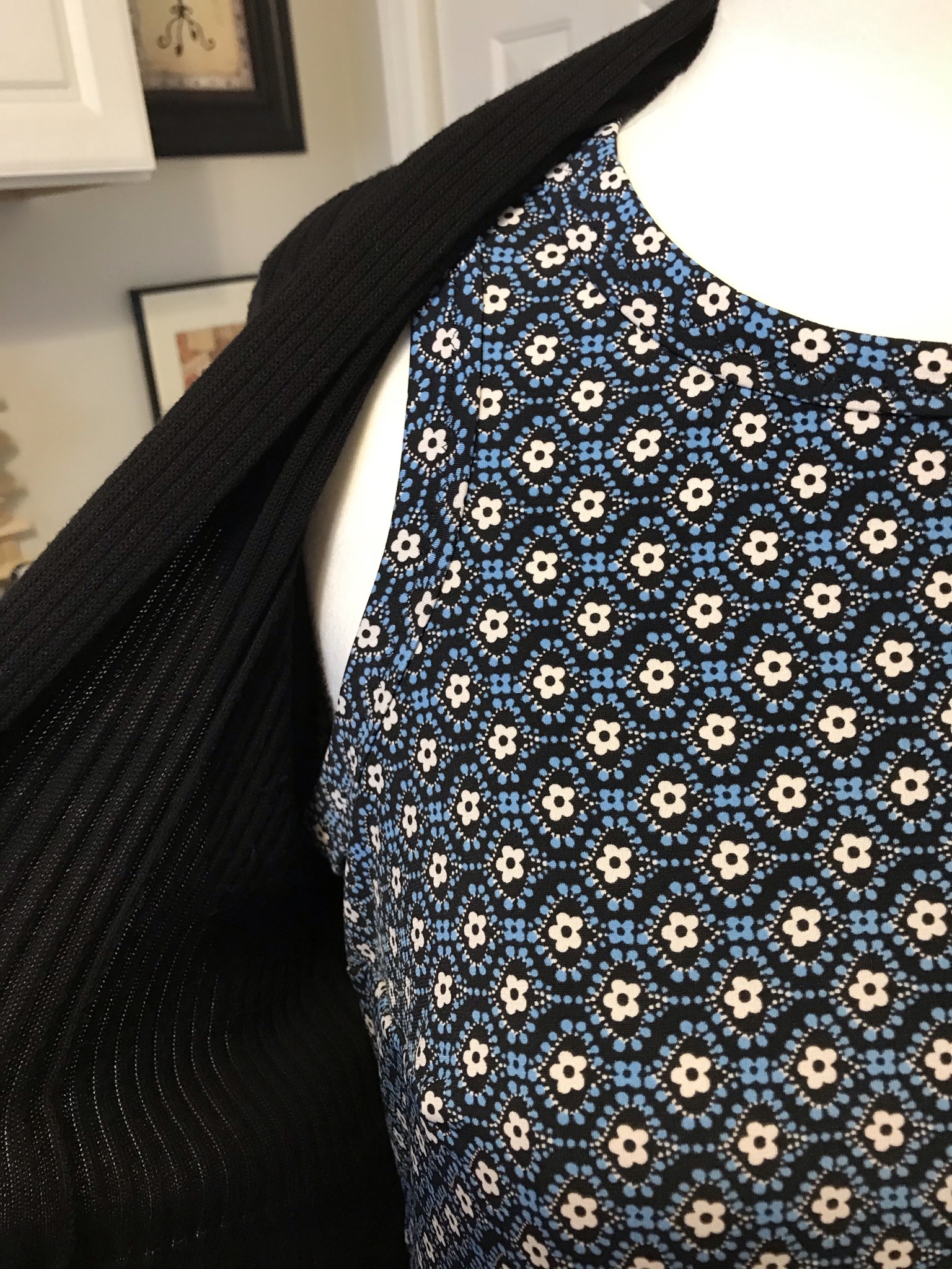 The beautiful black/blue floral silky fabric was purchased from The Fabric Depot. It worked out very well and washed/dried to perfection prior to use! The bust darts were created on my Ovation Serger which is a great way to reduce bulk on knits with darts. A little scary the first time you use a serger for darts but with a little practice it becomes super easy.