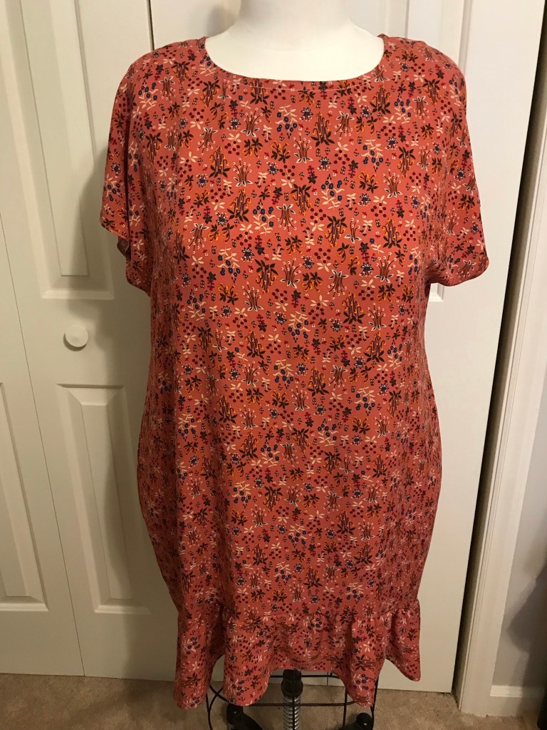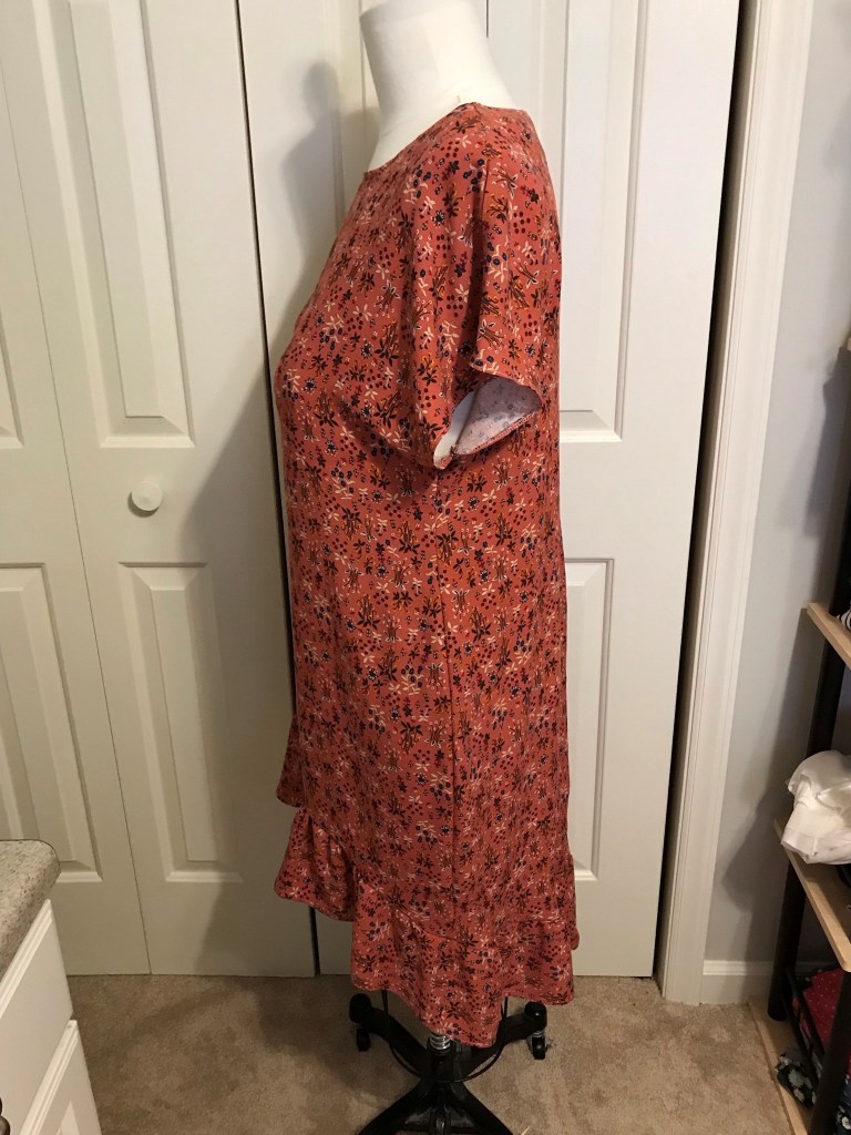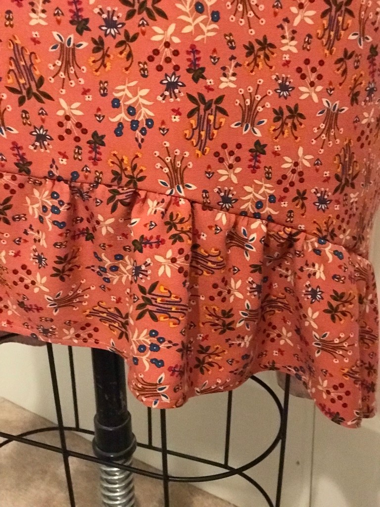 First, in a cotton purple eyelet. Second, in a rayon coral with lovely drape. The Laura in coral also has a “hacked” ruffle hem. This was an easy to do hack and gives the dress a new look.